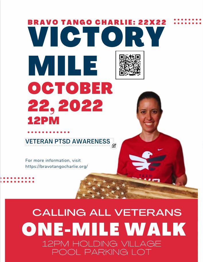 On October 22, 2022, my 22nd time walking 22-miles, I would like to invite the community of Wake Forest to join me in the last mile, the 484th mile: the Victory Mile. Those battling PTSD have Victory, they are not defeated! And as a community, we are here to support them!